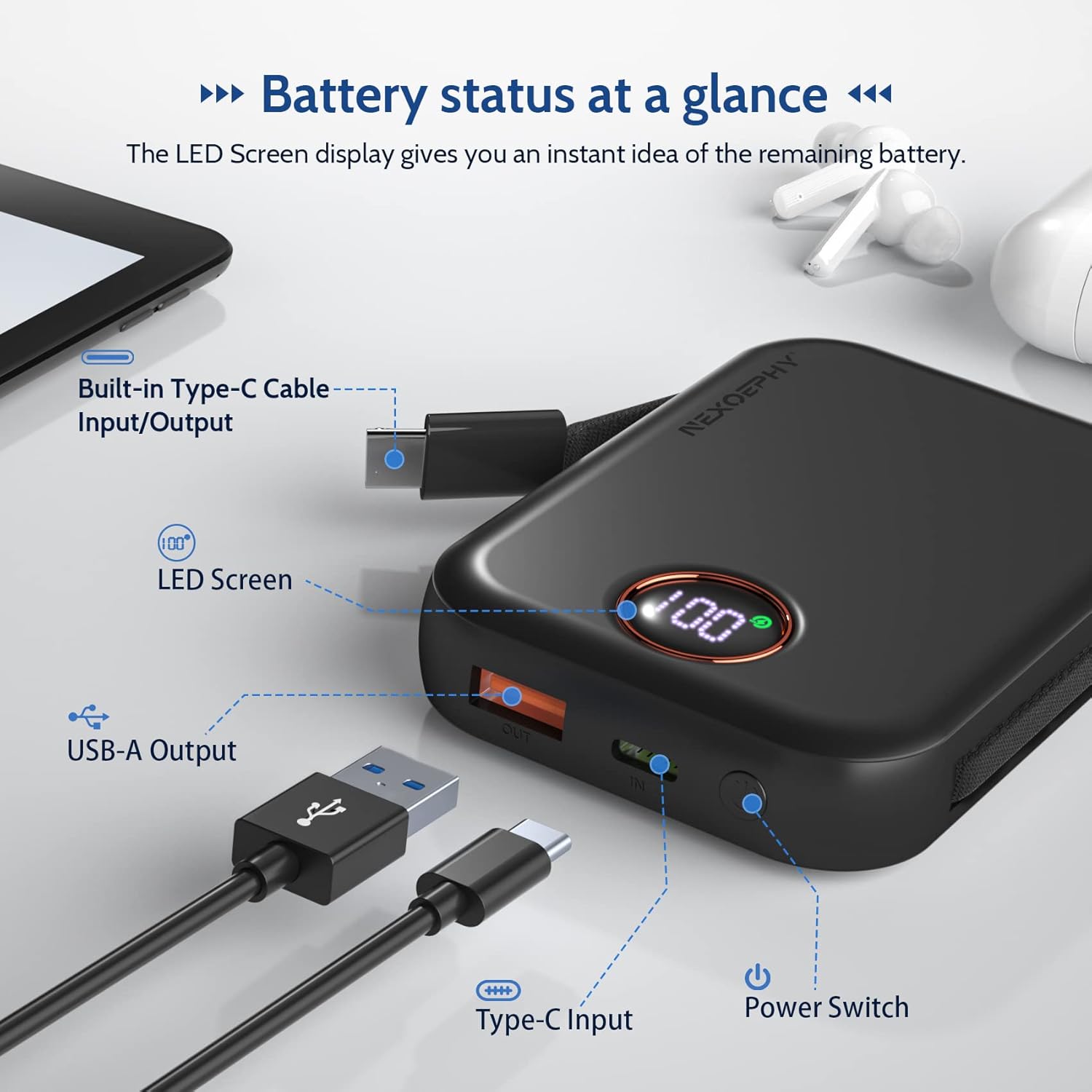 Built-in Type-C cable, USB ports & wireless charging for up to 4 devices.