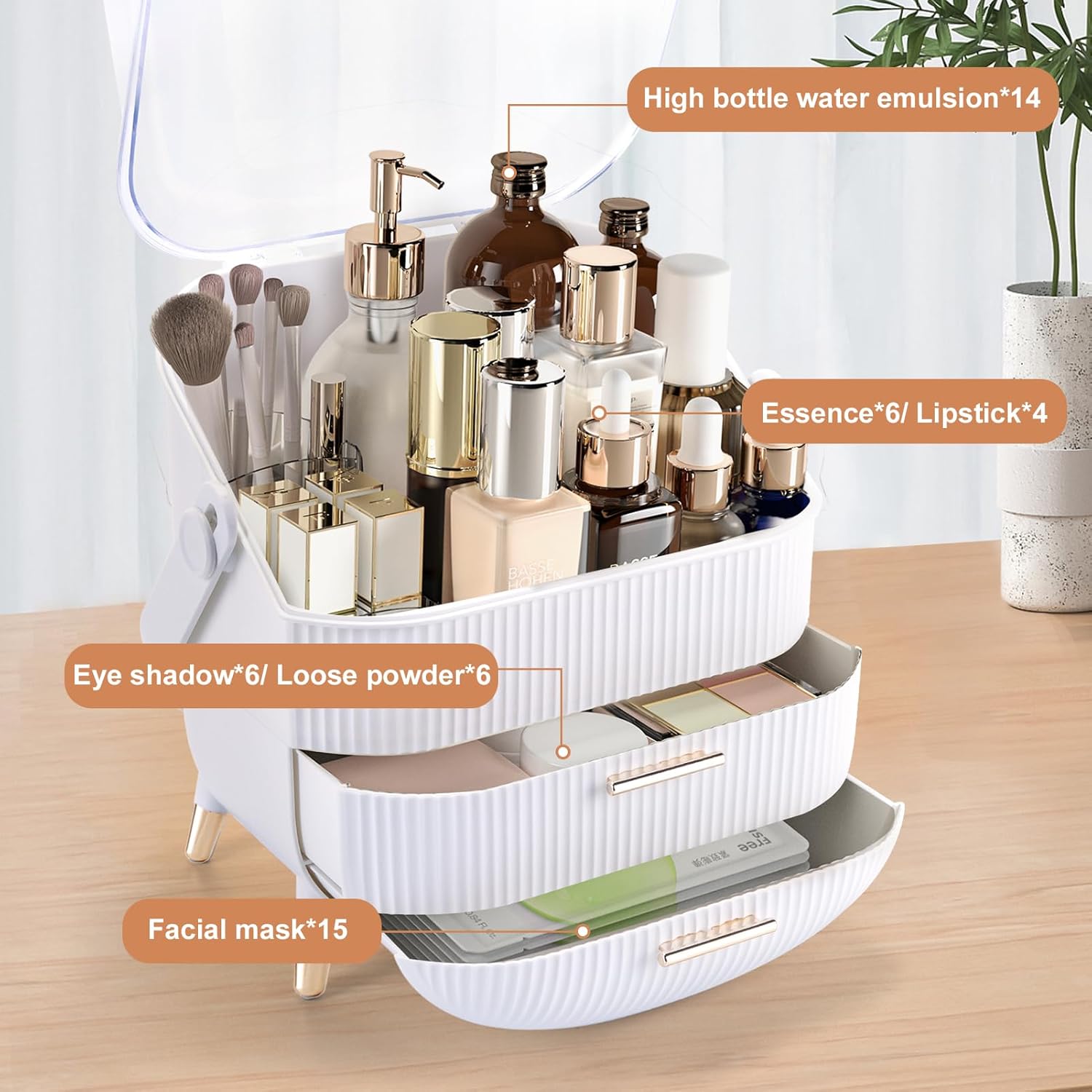 3 layers to fit tall bottles, lipsticks, powders, jewelry, and more, all in one place.