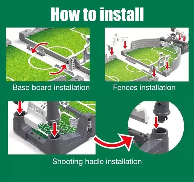 Assemble the base, goal, fence, and handle for quick game readiness.